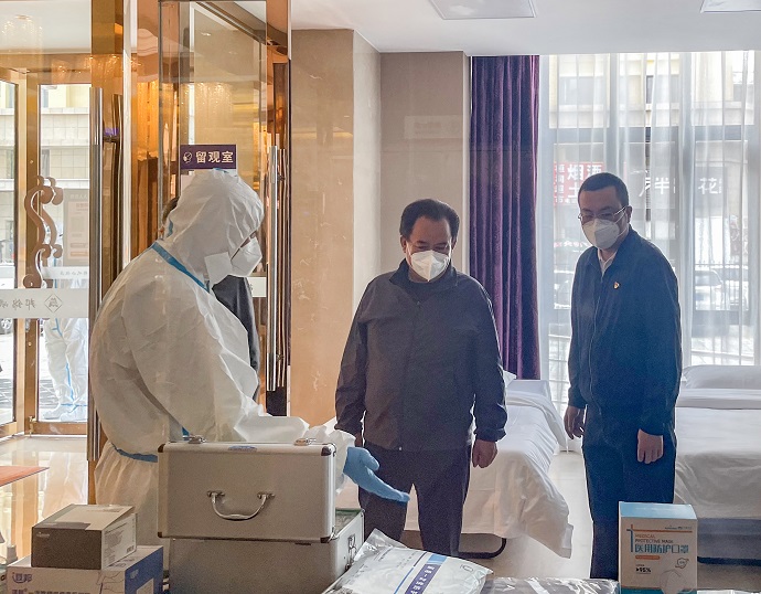 多吉次珠一行詳細察看了西藏開投邦錦花園酒店出入登記點、留觀室、疫情防控物資儲備室、全日制餐廳等區(qū)域,聽取了酒店疫情防控工作匯報。聽取匯報后,多吉次珠對酒店全力做好一線抗疫醫(yī)務工作者和公安民警后勤保障工作給予高度評價。他指出,西藏開投邦錦花園酒店站位高、有擔當,主動承擔抗疫一線干部職工保障工作重要任務,充分彰顯了國企擔當、國企速度、國企精神,有力發(fā)揮了國資國企的“頂梁柱”作用。