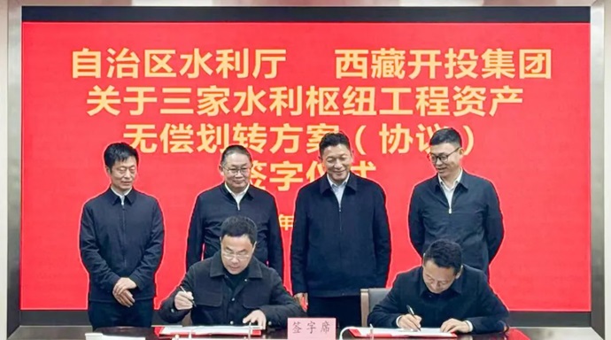 12月11日,自治區(qū)水利廳與西藏開投集團在拉薩簽署旁多、滿拉、拉洛三大水利樞紐工程資產(chǎn)無償劃轉(zhuǎn)協(xié)議,標(biāo)志著西藏國有企業(yè)改革邁出堅實步伐。自治區(qū)水利廳黨組副書記、廳長和忠華,區(qū)政府國資委黨委委員、副主任于雷,西藏開投集團黨委書記、董事長祁騰武出席簽字儀式并講話。自治區(qū)水利廳黨組成員、副廳長趙輝與西藏開投集團黨委委員、副總經(jīng)理尼瑪代表雙方簽署協(xié)議。集團領(lǐng)導(dǎo)羅布次仁、陳焱罡出席儀式。
