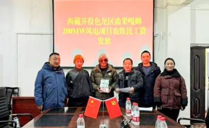 11月28日、12月2日,西藏開投那曲河水電公司組織舉行色尼區(qū)曲果嘎姆200MW風(fēng)電項(xiàng)目農(nóng)牧民工資發(fā)放儀式,為羅瑪鎮(zhèn)、香茂鄉(xiāng)5個(gè)村共計(jì)338人發(fā)放工資129.96萬元。