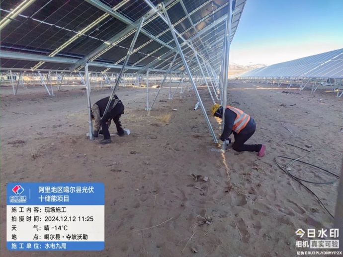 ▲噶爾光伏發(fā)電項目,現(xiàn)場施工人員加固光伏板支架。