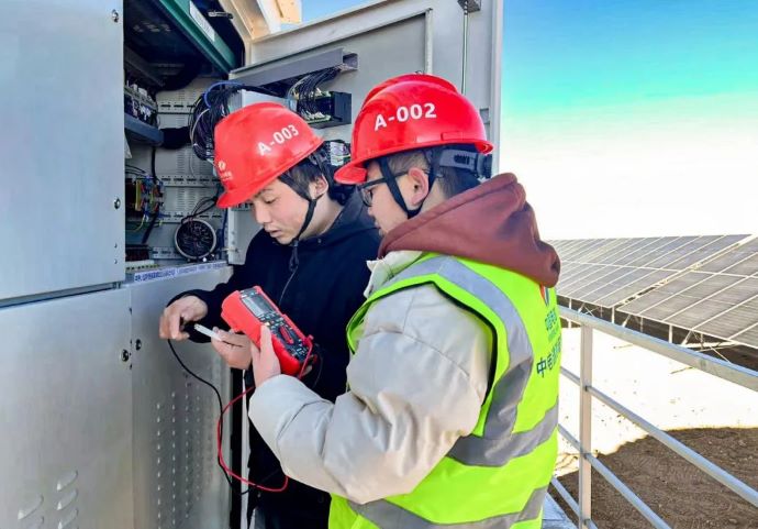 ▲噶爾光伏項目,現(xiàn)場施工人員檢查儲能設(shè)備。