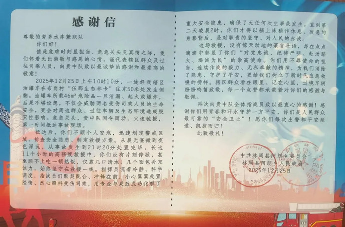 近日,西藏開投旁多水電公司兼職消防隊獲林周縣阿朗鄉(xiāng)黨委、政府授予的錦旗與感謝信,表彰其在一起危化品運輸車輛側翻事故救援中的突出貢獻。