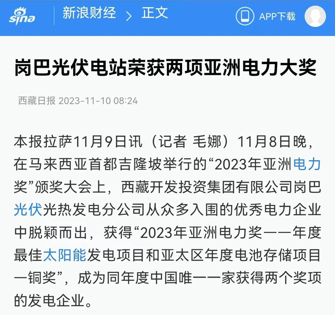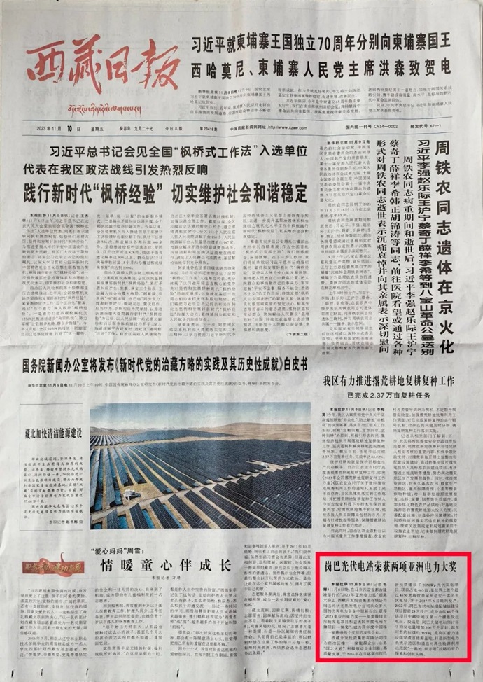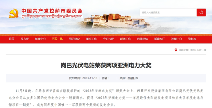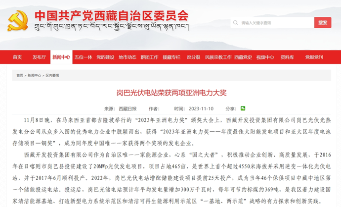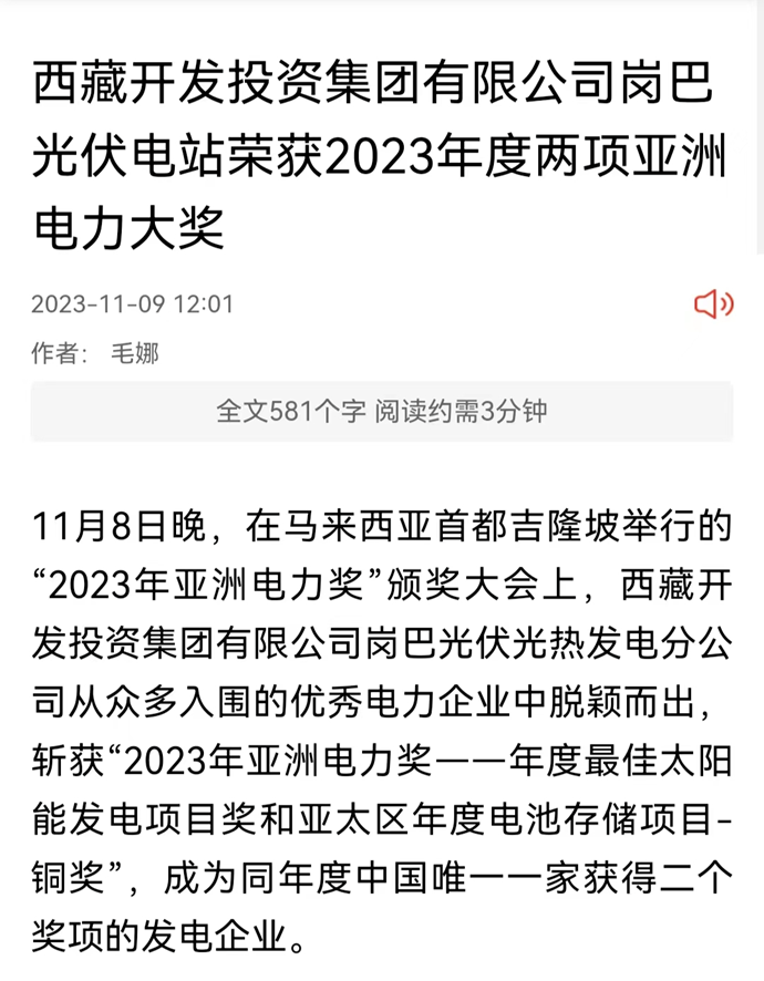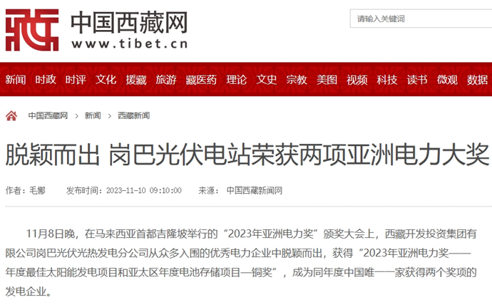 編者按:11月9-10日,科技日報(bào)、西藏日報(bào)、西藏日報(bào)客戶端、新浪財(cái)經(jīng)客戶端、中國西藏網(wǎng)、中國共產(chǎn)黨西藏自治區(qū)委員會(huì)官網(wǎng)、中國共產(chǎn)黨拉薩市委員會(huì)官網(wǎng)等多個(gè)媒體報(bào)道了《西藏開發(fā)投資集團(tuán)有限公司崗巴光伏電站榮獲2023年度兩項(xiàng)亞洲電力大獎(jiǎng)》。全文如下: