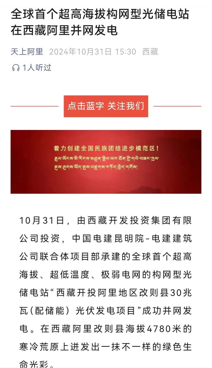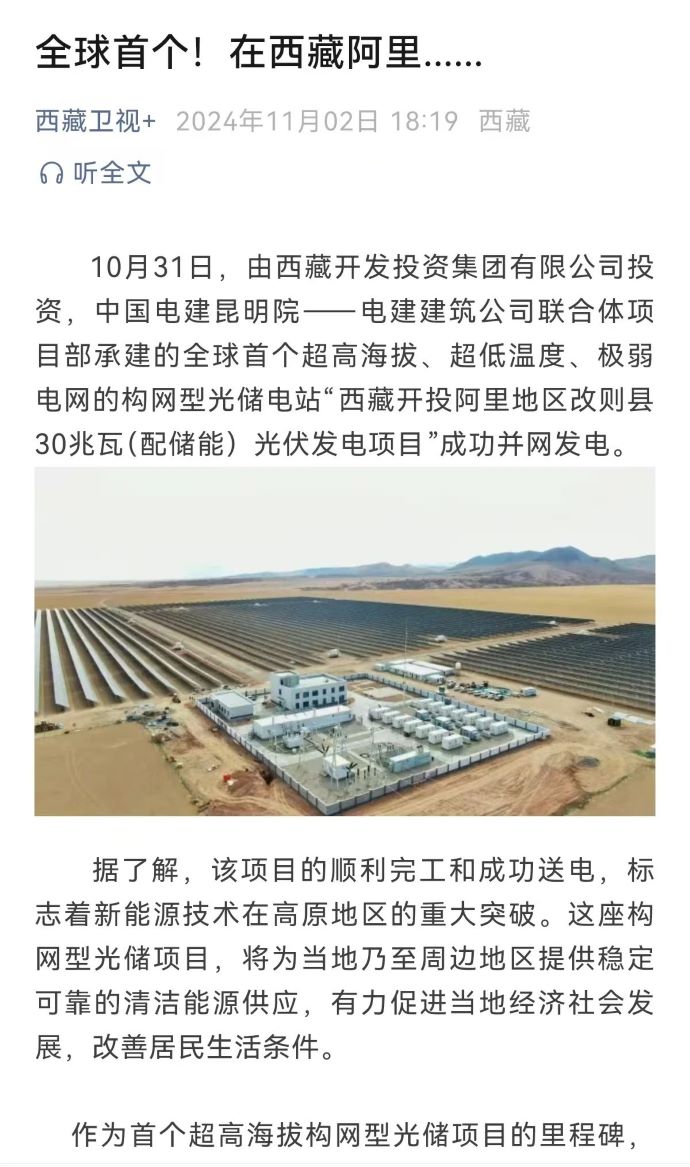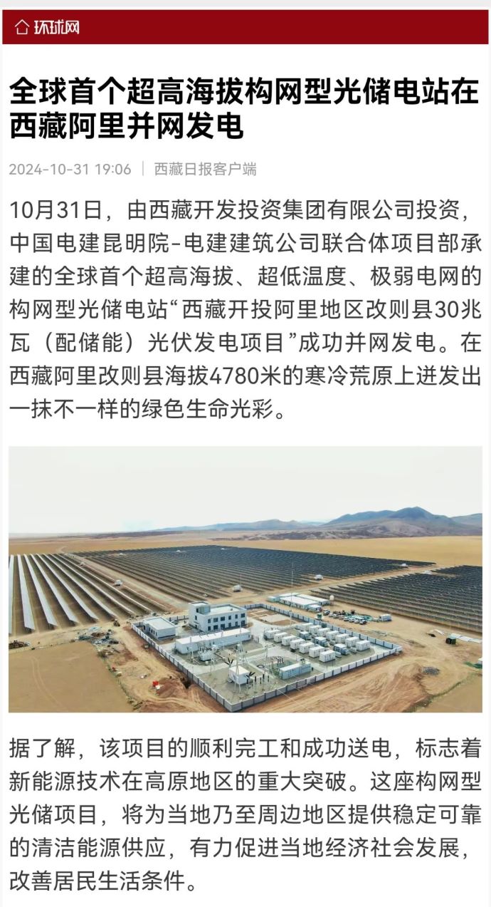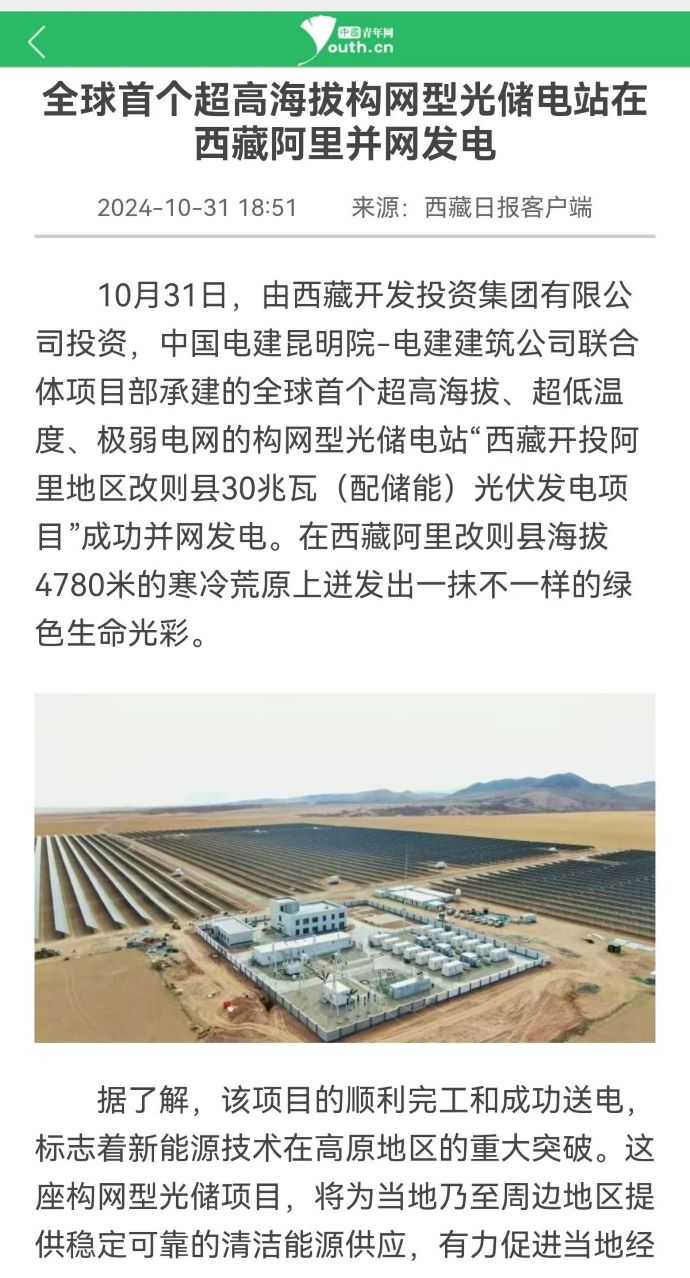 10月31日,由西藏開投集團投資、中國電建昆明院-電建建筑公司聯(lián)合體項目部承建的,全球首個超高海拔、超低溫度、極弱電網(wǎng)智能組串式構(gòu)網(wǎng)型光儲電站——西藏開投阿里地區(qū)改則縣30兆瓦(配儲能)光伏發(fā)電項目,成功并網(wǎng)發(fā)電,標志著新能源技術(shù)在高原地區(qū)的重大突破。