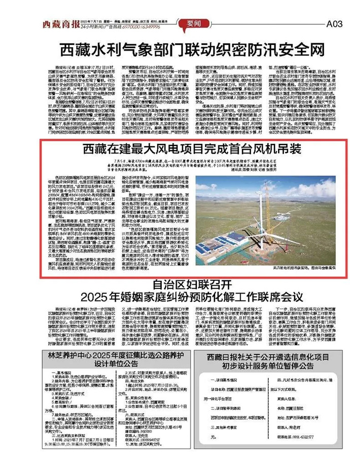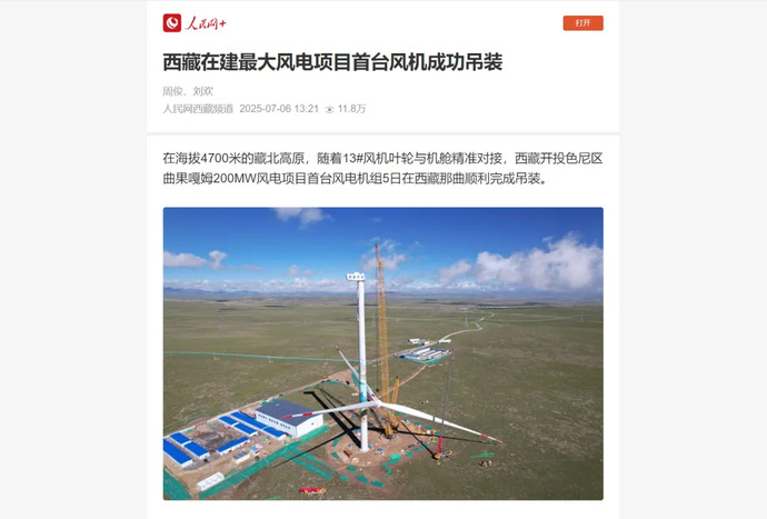 媒體報道丨西藏在建最大風(fēng)電項目完成首臺風(fēng)力發(fā)電機(jī)組吊裝