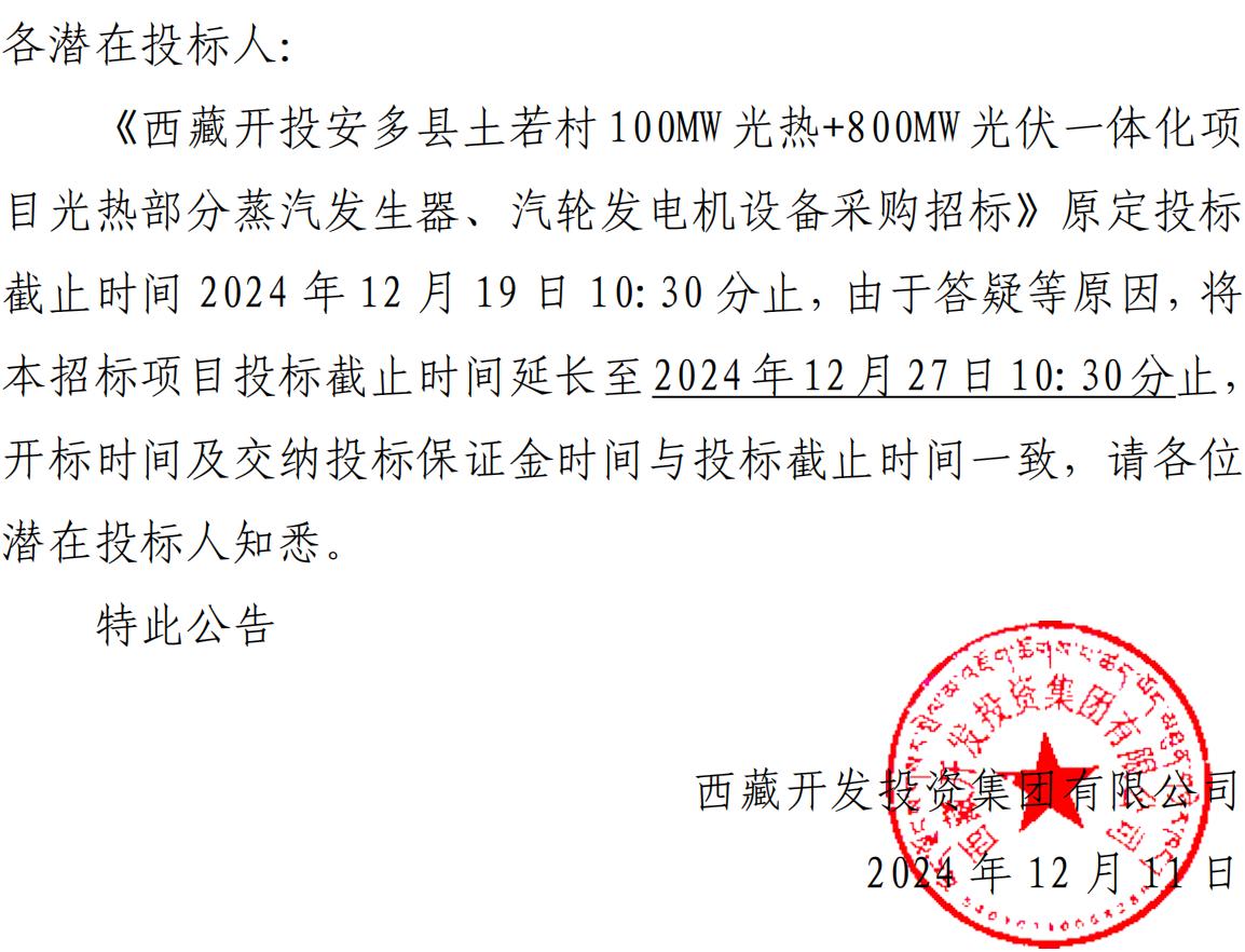 關(guān)于延長(zhǎng)《西藏開(kāi)投安多縣土碩 100MW 光熱+800MW 光伏一 體化項(xiàng)目光熱部分蒸汽發(fā)生器、汽輪發(fā)電機(jī)設(shè)備采購(gòu)招標(biāo)》投 標(biāo)截止時(shí)間的公告