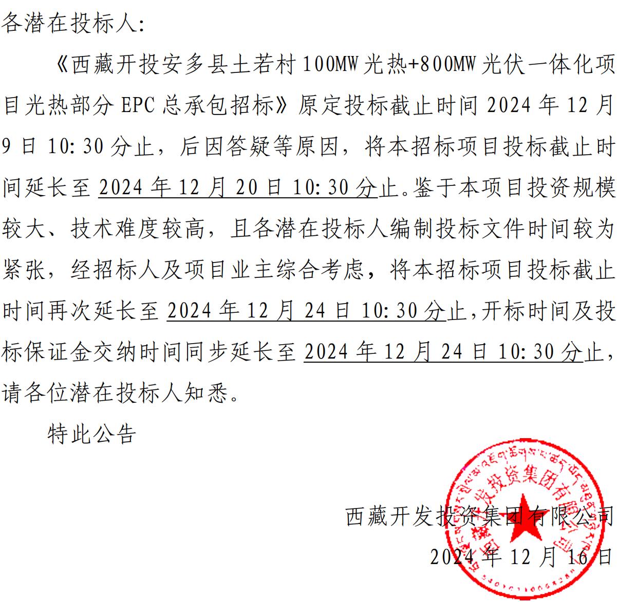 關(guān)于再次延長《西藏開投安多縣土碩 100MW光熱+800MW 光伏一體化項目光熱部分 EPC總承包招標(biāo)》投標(biāo)截止時間的公告