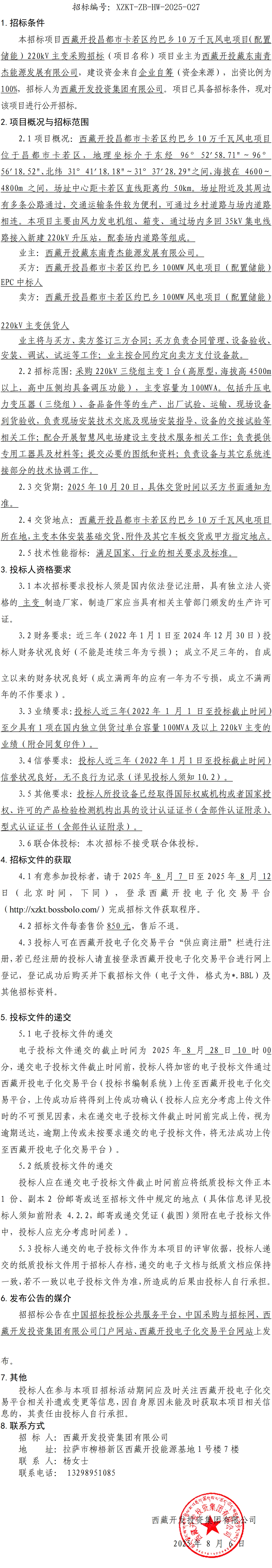 西藏開投昌都市卡若區(qū)約巴鄉(xiāng) 10 萬千瓦風(fēng)電項目(配置儲能)220kV 主變采購招標(biāo)公告