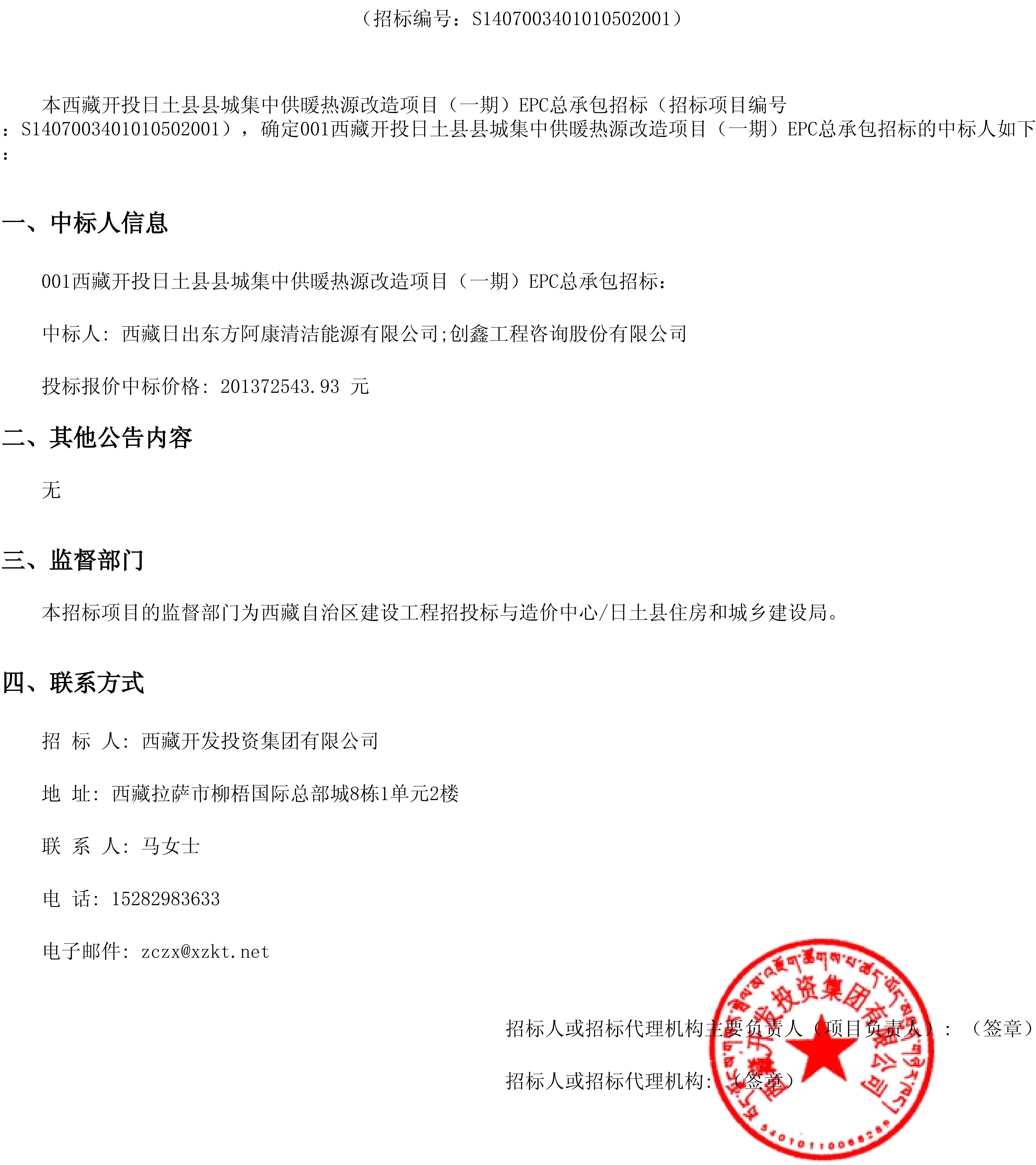 西藏開(kāi)投日土縣縣城集中供暖熱源改造項(xiàng)目(一期)EPC總承包招標(biāo)項(xiàng)目中標(biāo)結(jié)果公告